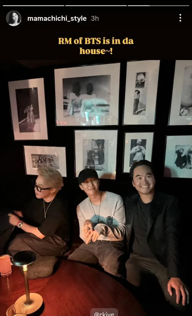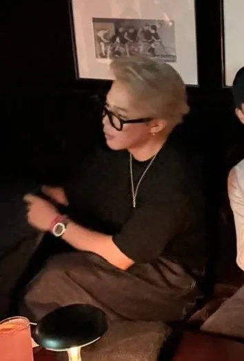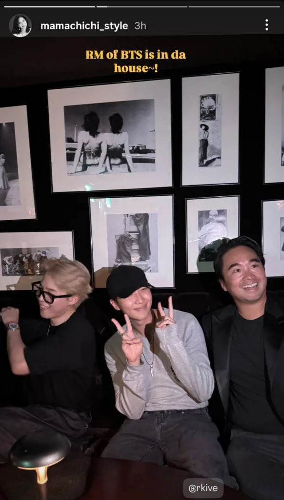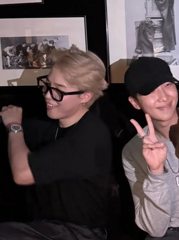 Jimin’s outfit was simple but sharp: a fitted black crew-neck shirt with denim jeans, accessorized with a long chain, glasses, and a watch. The real highlight, of course, was his new blonde hair, which stood out under the event lights. RM complemented the scene with a casual grey long-sleeve tee, faded jeans, and a Yankees cap.