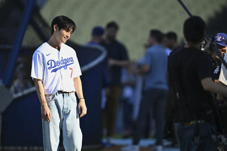 Wearing a Dodgers jersey with the number 7 proudly displayed on the back, Kim Taehyung, better known as V, stepped onto the mound to thunderous cheers. Before delivering his left-handed throw, V bowed slightly to Dodgers pitcher Yoshinobu Yamamoto in a respectful gesture. The moment captured the perfect blend of Korean culture, global stardom, and America’s favorite sport.